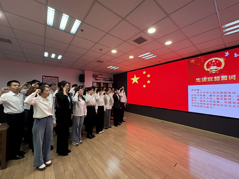 宣誓仪式现场,全体宣誓人员面向国旗,奏唱中华人民共和国国歌。领誓人领诵誓词,其他宣誓人员高举右拳,以坚定的目光和铿锵有力的声音跟诵誓词,彰显了统计人对宪法的尊崇和敬畏,以及维护宪法权威、捍卫宪法尊严的决心。